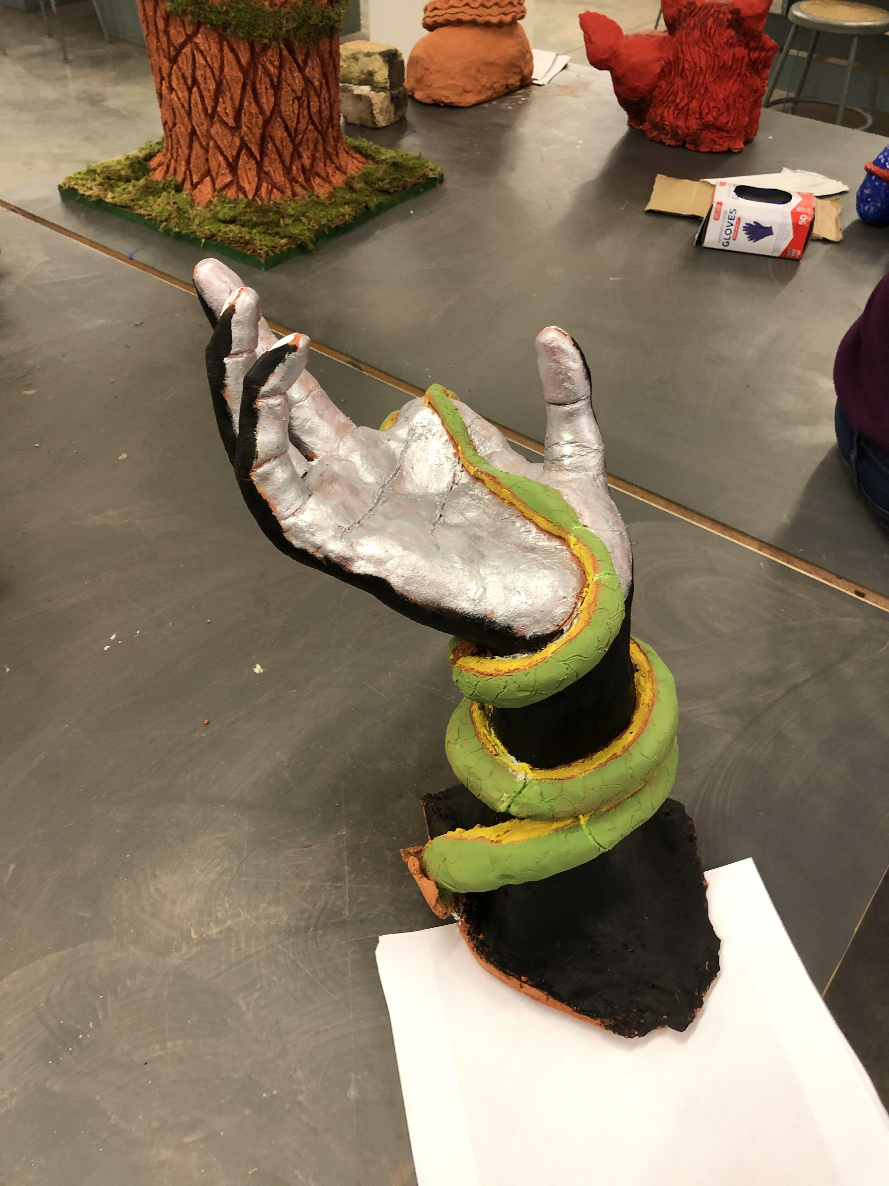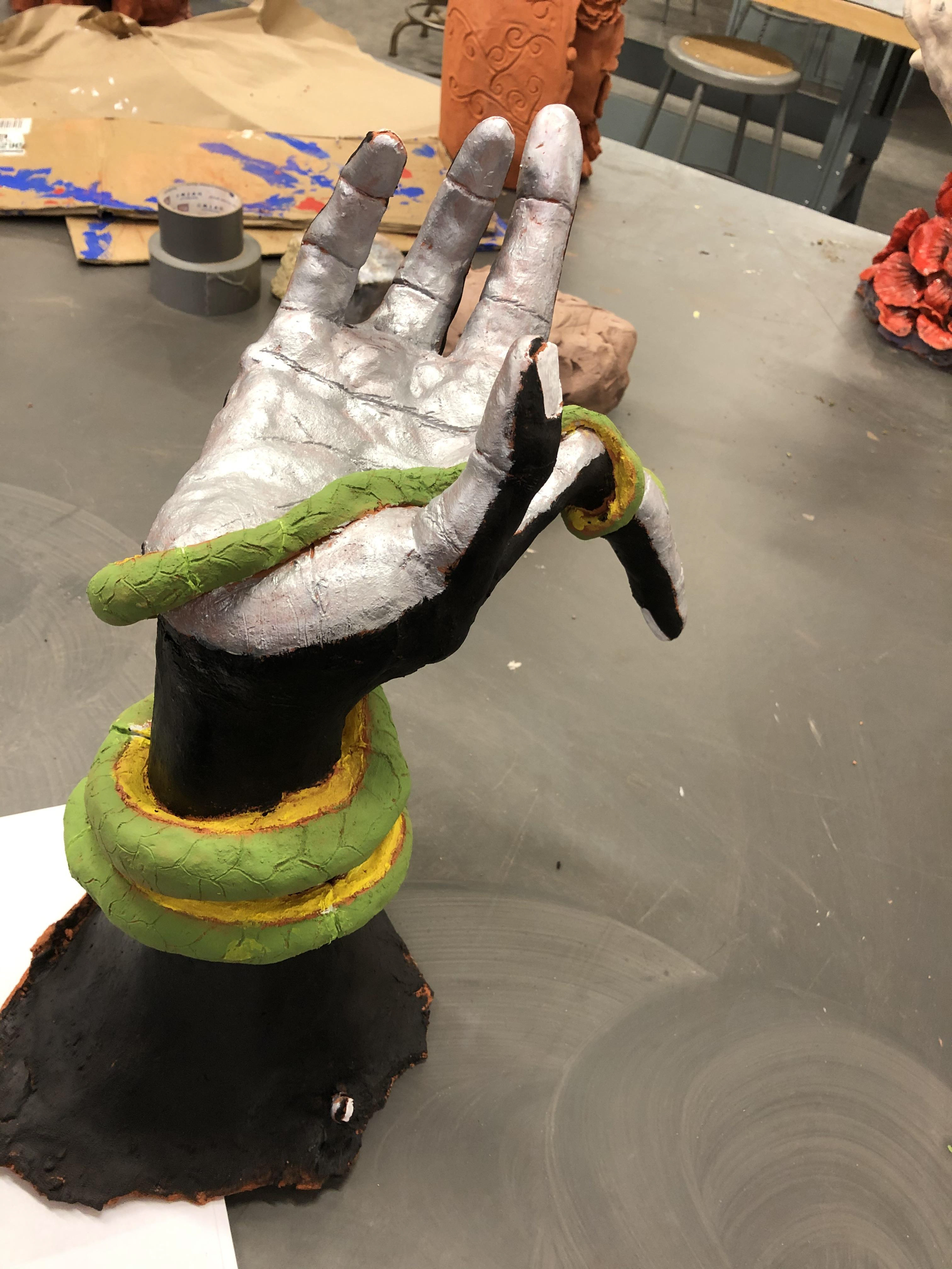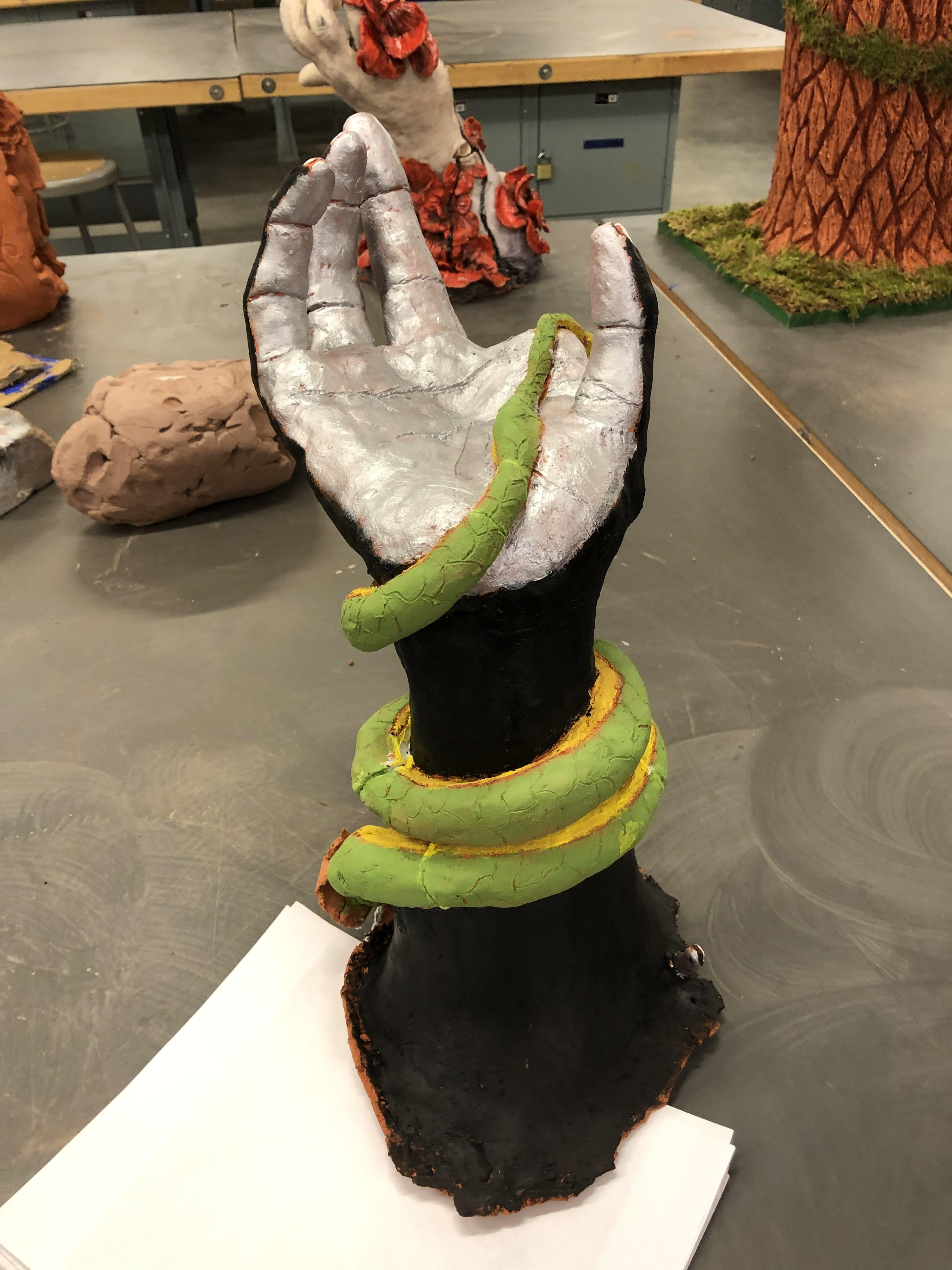 Figure Modeling 1 was my first time experiencing sculpture. I came into it very daunted because it was something I had never undertaken before. I was completely new to it, and it showed. My first project in the class was sculpting a hand at about life-size. I toiled through nights trying to make it work and found the process relaxing and meditative. Despite this, the hand never looked quite right, the thing ended up looking almost robotic by the deadline. I was both proud to have completed something in a new form and medium, and disappointed in my ineptitude. Flash forward a few weeks later, and our professor gave us our final project. We were to sculpt in the surreal, it was an open-ended project that gave us free rein. As I thought about it, I instantly knew the exact topic for my final project, the human hand. A redemption arc for the poor-quality hand I had made before. But this one would be harder, at least three times more extensive, and with much more detail.
